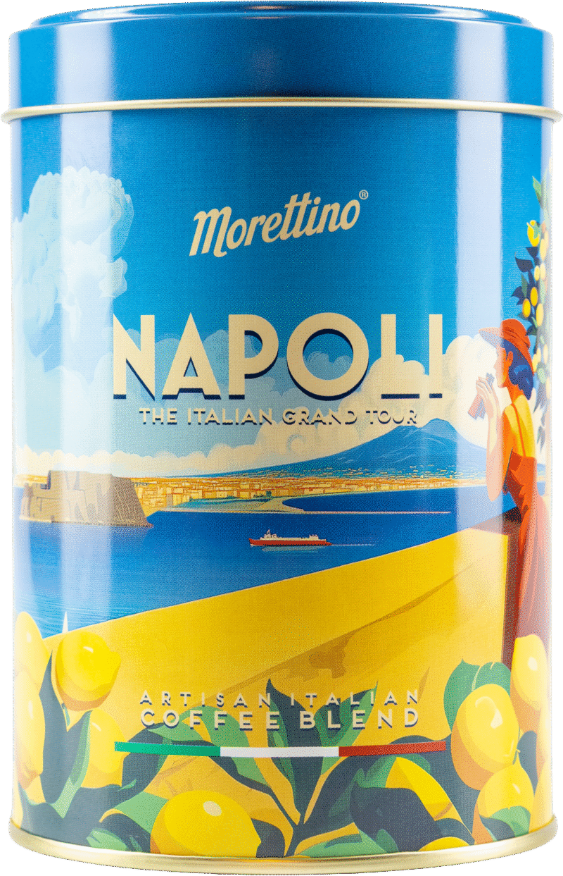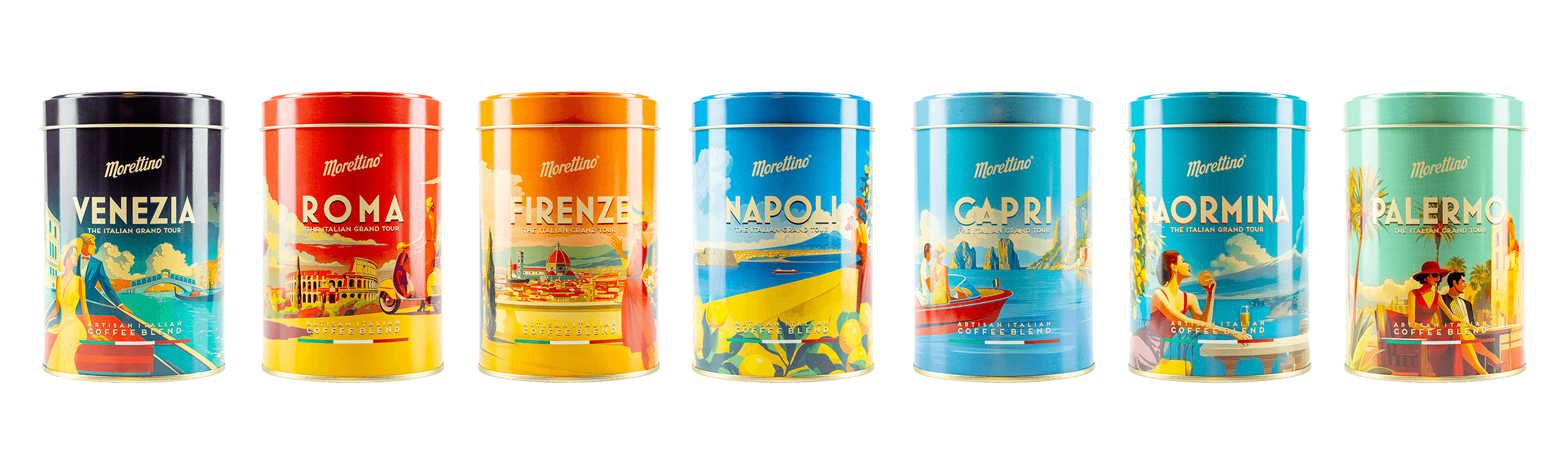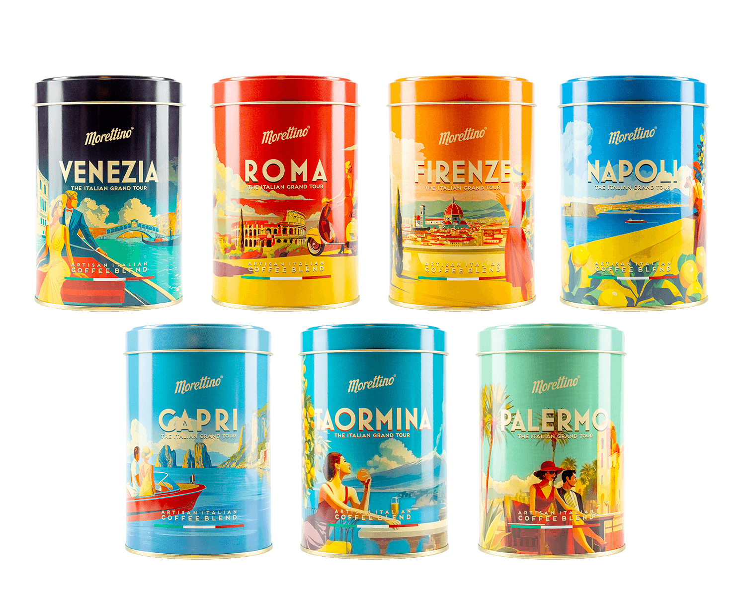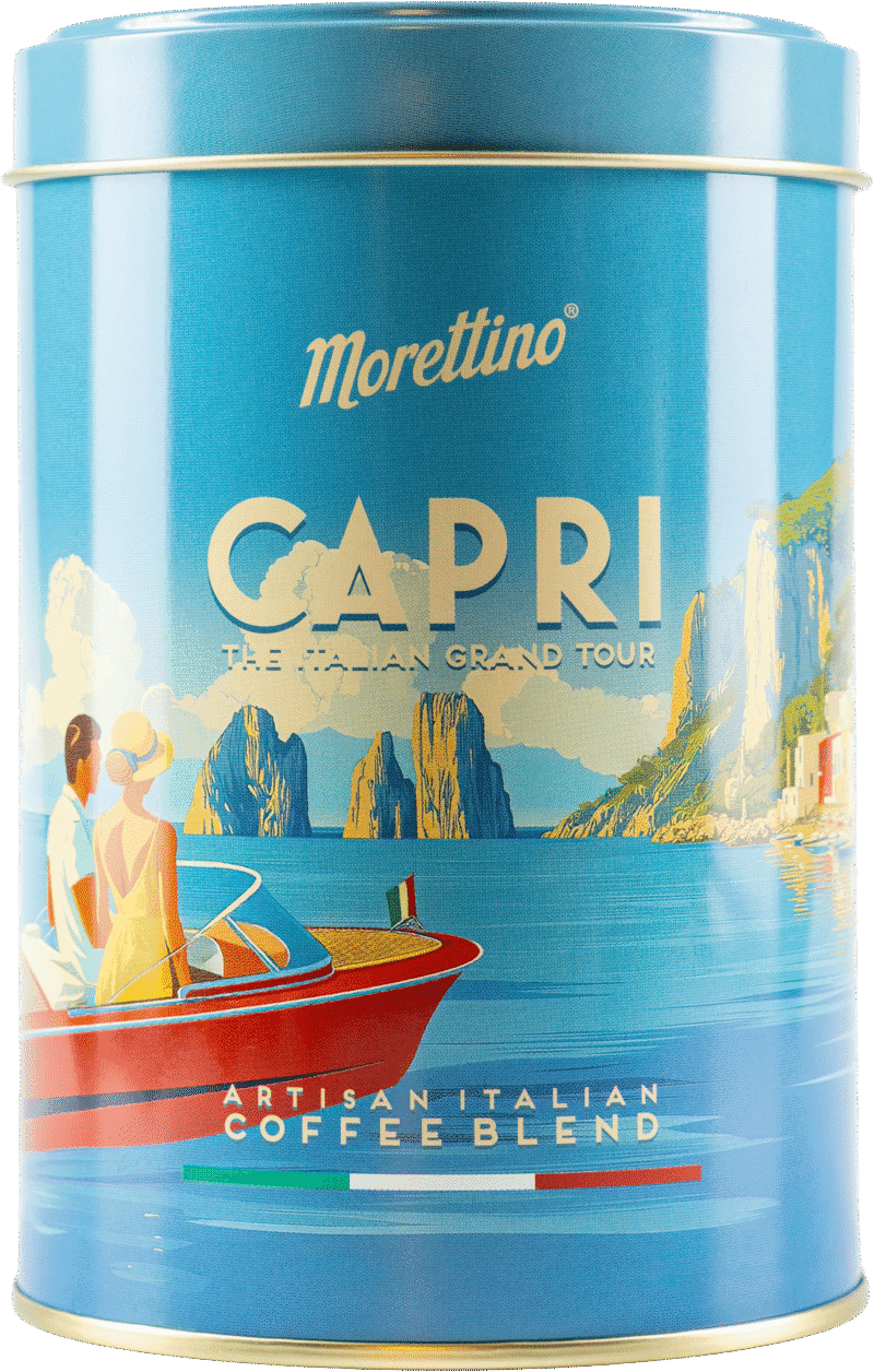 Morettino “The Italian Grand Tour” è la collezione esclusiva che celebra lo stile, i colori, la bellezza e la leggerezza dell’italian way of life. Un viaggio tra le bellezze iconiche dell’Italia, attraverso lo stile dei manifesti turistici degli anni ’50, in una serie di 7 latte da collezionare contenenti 7 blends di caffè ispirati ad ognuna delle località rappresentate.