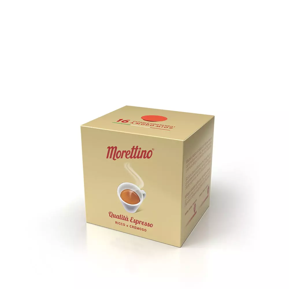 The taste of the Morettino tradition in a new guise. To celebrate 40 years of “Qualità Espresso” the blend that has made the history of Morettino, here comes the new line “Qualità Espresso” in Lavazza A Modo Mio * compatible capsules. Sicilian classical blend with strong flavors of caramel and hazelnut, for a full taste espresso and chocolate notes.