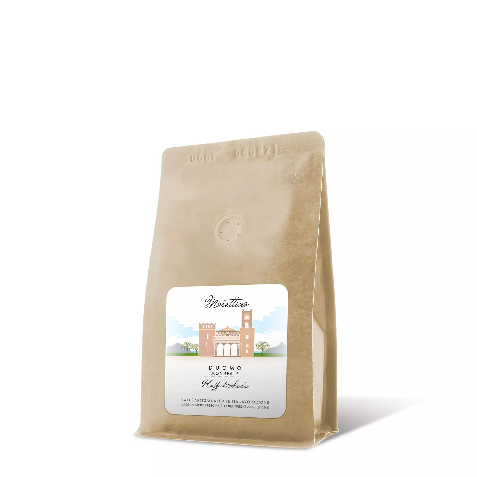 Custodita dentro ogni pacco c’è una speciale miscela di caffè macinato fresco, tostata dai maestri torrefattori Morettino per richiamare alla mente gli aromi e i sapori del territorio della Conca d’Oro. Miscela armoniosa, con piacevoli sentori di mandarino tardivo di Ciaculli e gelsomino.