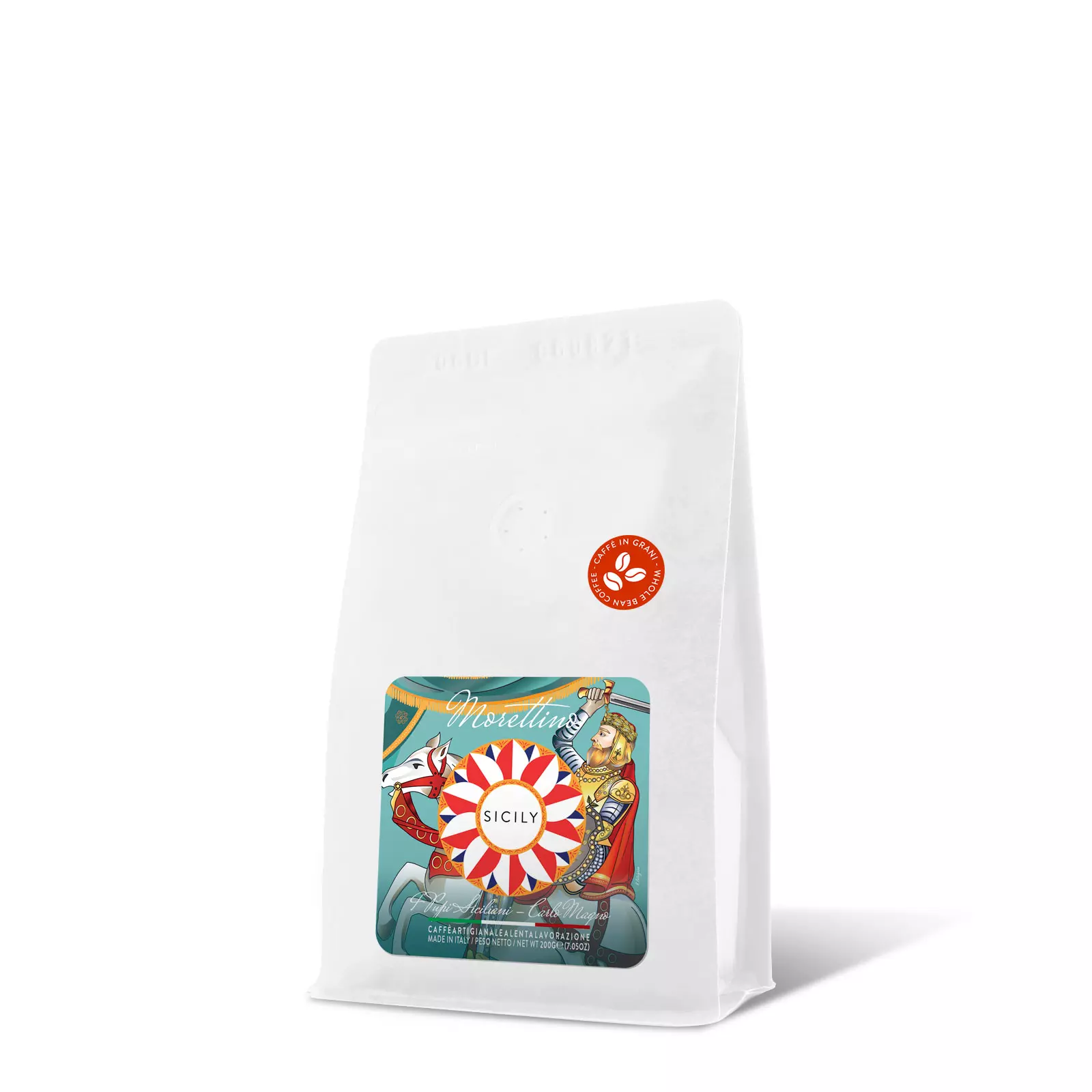 Esclusivo blend di caffè artigianale macinato fresco, creato secondo l’antica tradizione siciliana, custodito all’interno del pacco morbido salva freschezza della linea “Sicily Boutique Coffee – I Pupi siciliani” che raffigura Carlo Magno, protagonista dell’Opera dei pupi.