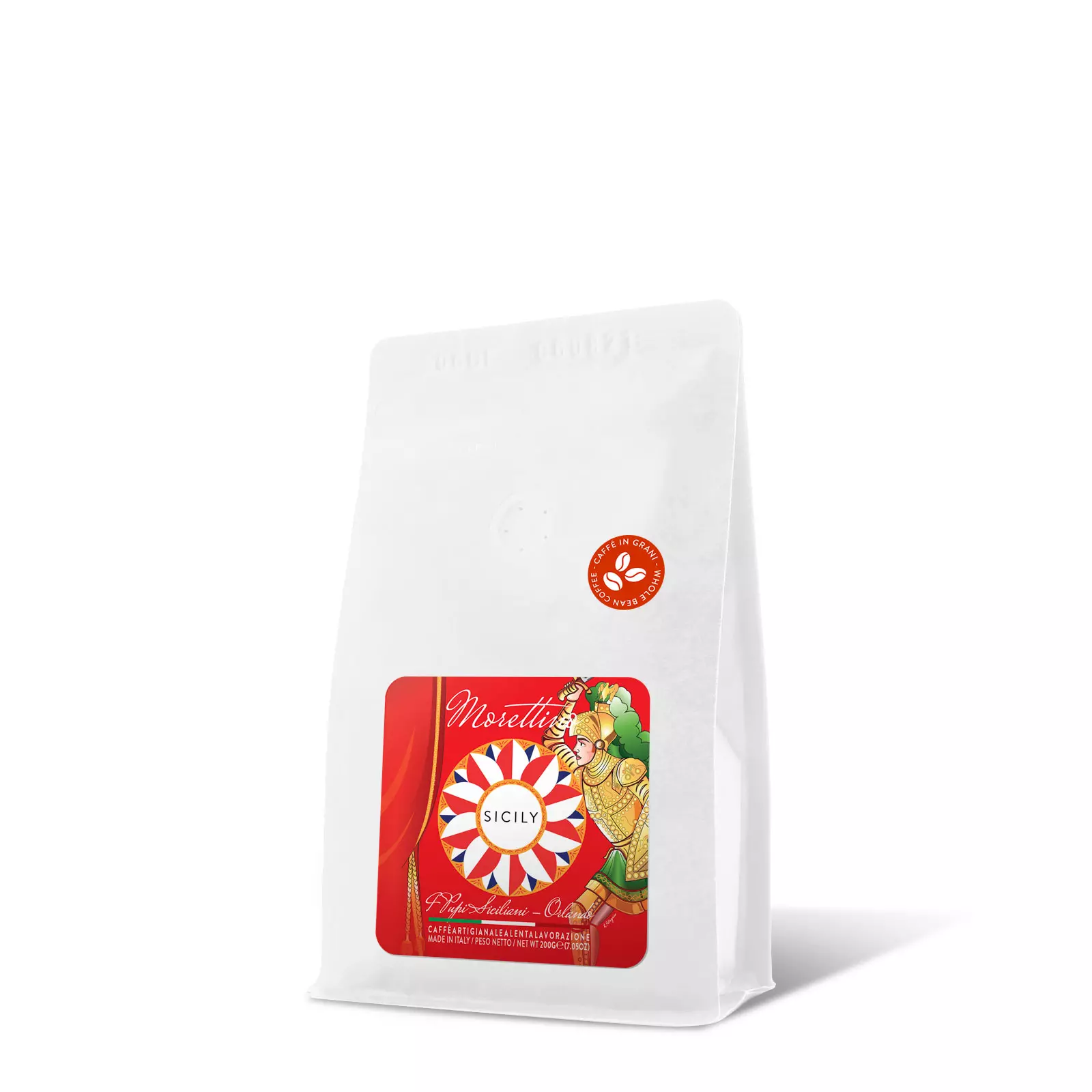 Esclusivo blend di caffè artigianale in grani, creato secondo l’antica tradizione siciliana, custodito all’interno del pacco morbido salva freschezza della linea “Sicily Boutique Coffee – I Pupi siciliani” che raffigura Orlando, protagonista dell’Opera dei pupi.